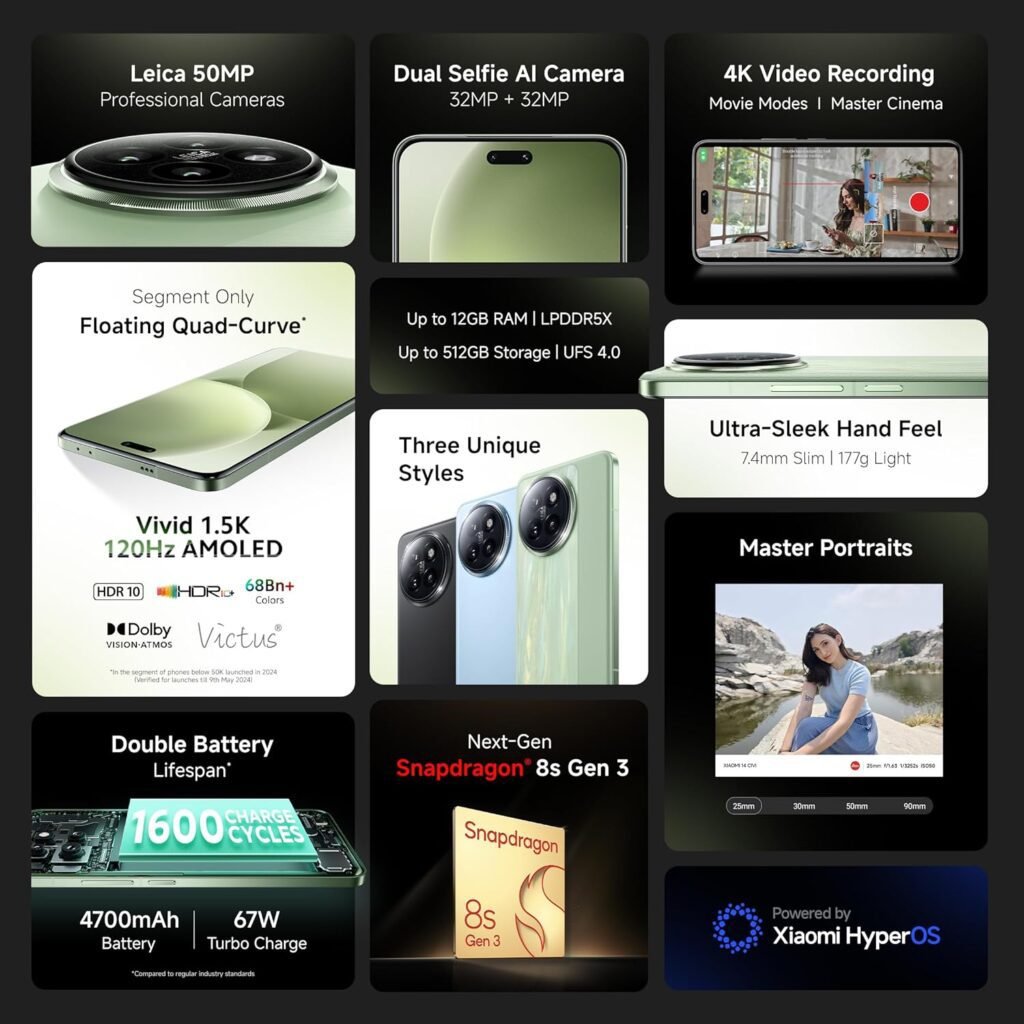 The Xiaomi 14 CIVI sports a 6.55-inch AMOLED display with a smooth 120Hz refresh rate and an impressive 3000 nits peak brightness. it runs on the Qualcomm Snapdragon 8s Gen 3 processor, 8GB RAM and 256GB UFS 4.0 storage.